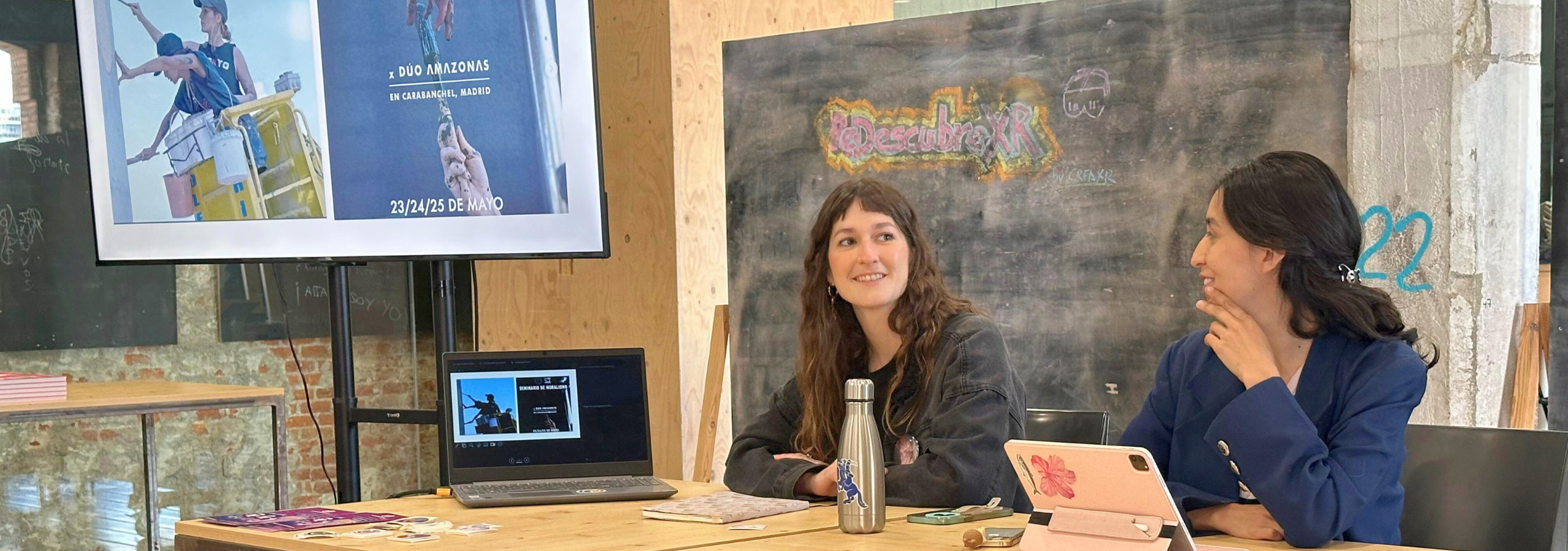 As guests we have Amazon duo (@duoamazonas), a collective of Latin American muralists, formed in 2017 by Nati Andreoli y Lina Sanabria, which in their large-format work propose the intervention of public space from subtlety, tenderness and the everyday. They told us about the the history of muralism, an artistic movement originally embraced by male artists but in which they soon began, and continue to do so, to highlight many women. In addition, they showed us some fundamental works of their career as a collective which, together with the numerous questions of the group of editors present there, served to better understand the role of urban art and mural painting in contemporary culture.