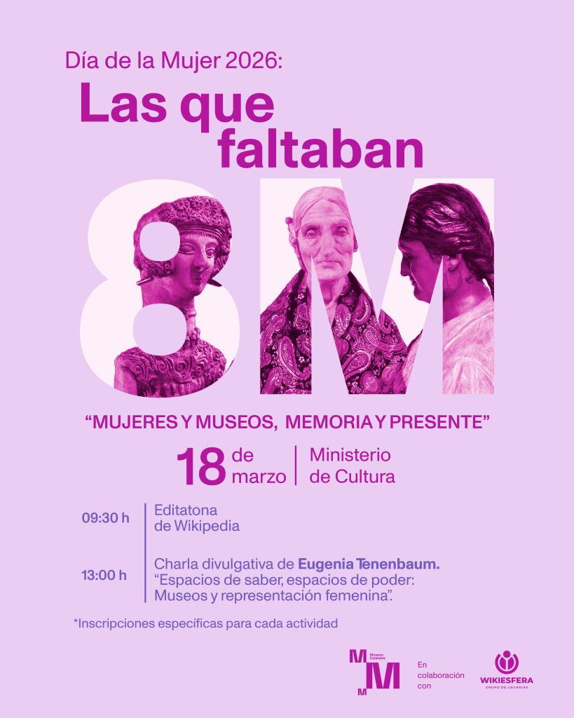 Con motivo del Día de la Mujer, desde Museos Estatales se impulsa una jornada especial bajo el lema “Las que faltaban. Mujeres y museos, memoria y presente” el próximo 18 de marzo, en colaboración con Wikiesfera. Una invitación a reflexionar sobre las ausencias históricas de las mujeres en los relatos culturales y a reivindicar su lugar en la memoria colectiva y en el presente de los museos.