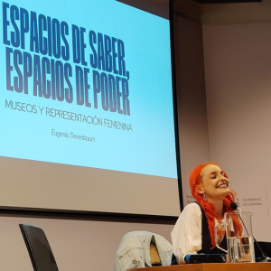 Con el título Espacios de saber, espacios de poder: Museos y representación femenina, Eugenia nos habló de los distintos tipos de cambios que se podían producir en los museos para promover la diversidad y la igualdad. Nos mostró la exigua cifra de obras hechas por mujeres que exhiben los principales museos del mundo frente a la abrumadora presencia femenina como visitantes y estudiantes de artes. Constató la importancia de la conformación de los equipos, destacando el hecho de que 9 de las 16 direcciones de los Museos Estatales las ostentan mujeres. Nos hizo pensar en el nivel de discurso y todas las posibilidades que se abren al revisar los textos museográficos o los criterios de interpretación. Y, finalmente, planteó la necesidad de actualizar, en clave de pensamiento crítico y apertura a la diversidad, los enfoques desde los que se transmiten los contenidos en estos espacios de saber, que también lo son de poder. La conclusión final no pudo ser más contundente: replantear el museo pasa por replantear la autoridad masculina que se nutre de él.